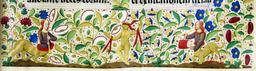Page enluminée : feuillet 436 : Lettre M : miniature : encadrement : détails