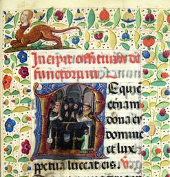 Page enluminée : feuillet 489 : Lettre R : miniature : encadrement : détails